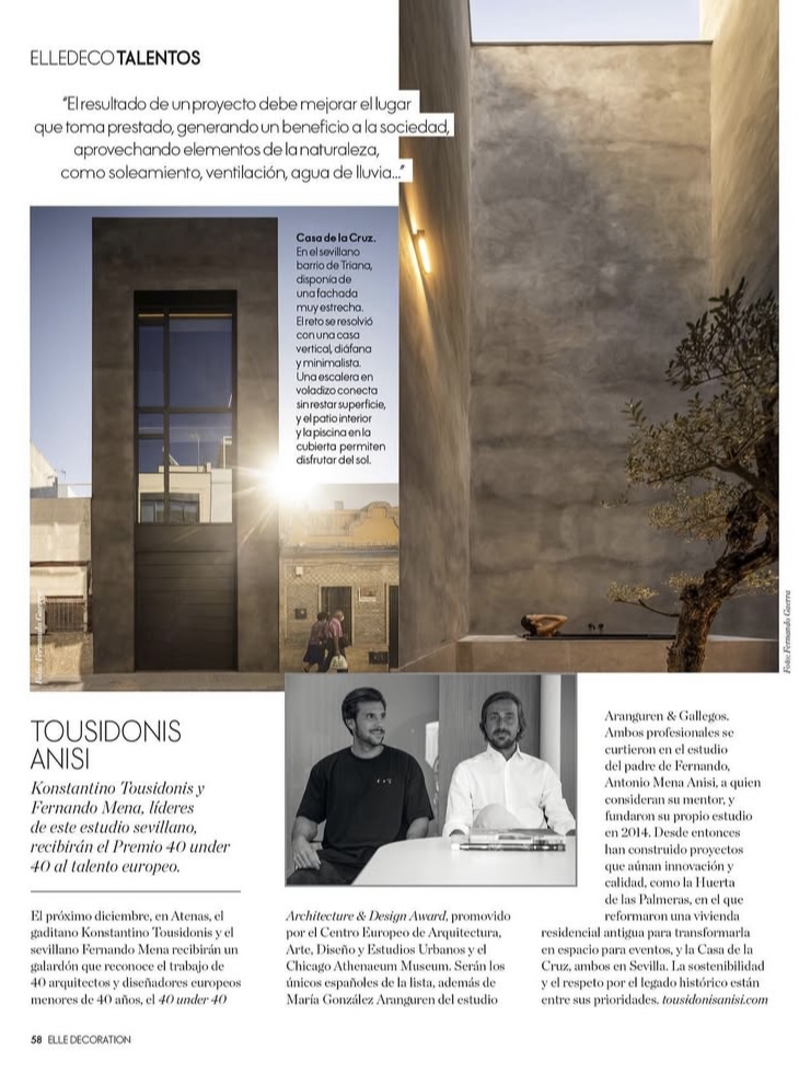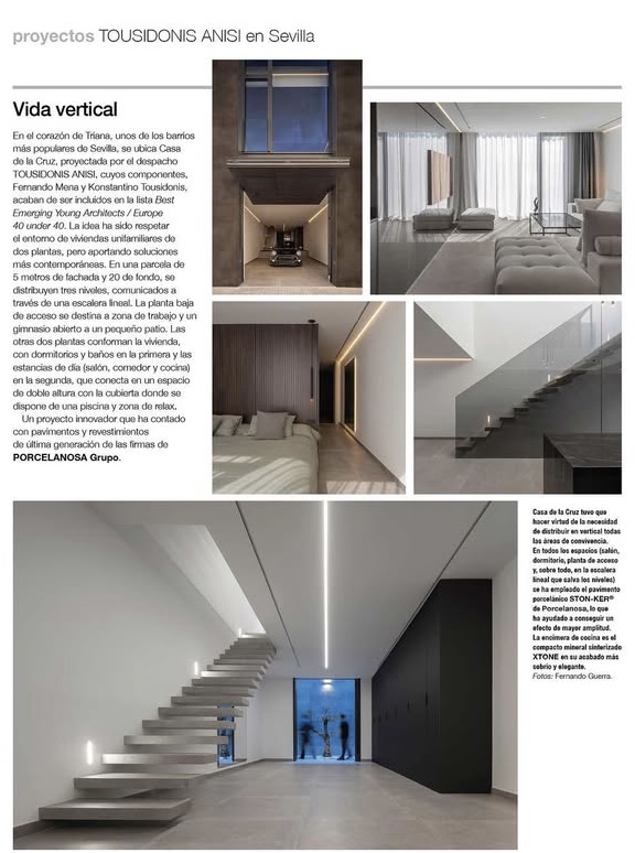El proyecto ha sido seleccionado y publicado en prestigiosas revistas como Elle Decoration y Lifestyle 40, publicaciones que recogen los proyectos de arquitectura y diseño más relevantes del panorama actual, situando a Casa de la Cruz como una referencia en el ámbito de la vivienda de lujo y la arquitectura contemporánea en Sevilla.