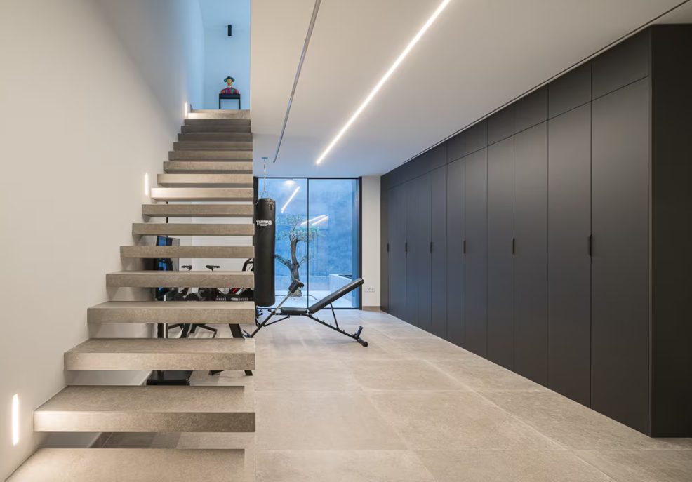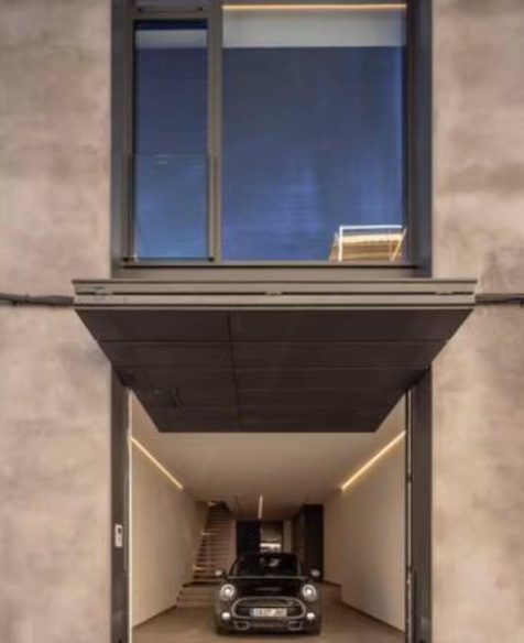 La parcela, de 5 metros de fachada y 20 metros de fondo, se organiza en tres niveles principales más cubierta, comunicados mediante una escalera lineal que articula de forma fluida todos los espacios. La planta baja de acceso se destina a zona de trabajo, garaje y gimnasio, abierto a un pequeño patio trasero que incorpora una fuente, un olivo centenario y una zona exterior ajardinada, aportando luz natural y privacidad.