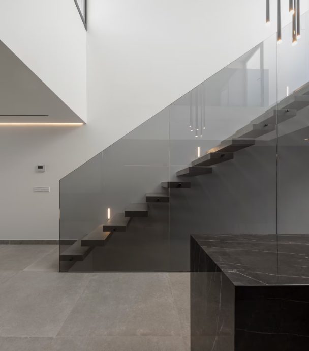 La obra incorpora materiales y sistemas constructivos de primer nivel, como pavimentos y revestimientos de Porcelanosa, carpinterías de Cortizo y sistemas correderos COR-VISION, garantizando eficiencia, durabilidad y una cuidada estética contemporánea.