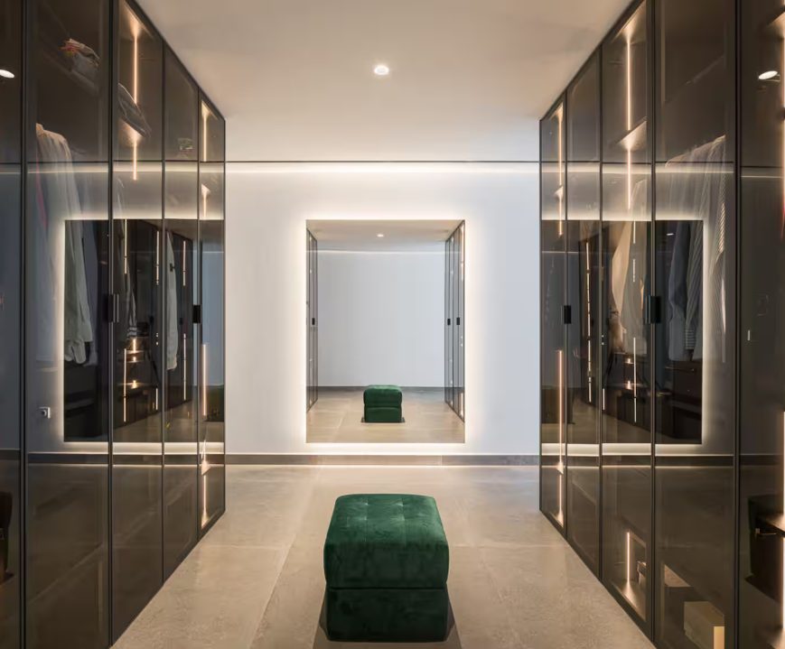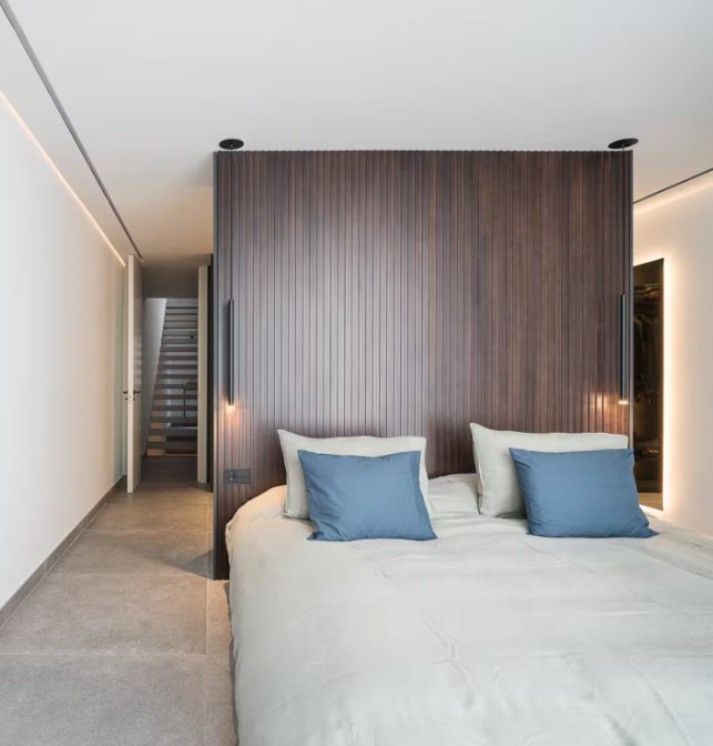 En la primera planta se desarrolla la zona de noche, compuesta por dos dormitorios. Uno de ellos dispone de dos camas individuales, mientras que el dormitorio principal cuenta con cama king size, vestidor y baño en suite, además de un segundo baño completo en el distribuidor.