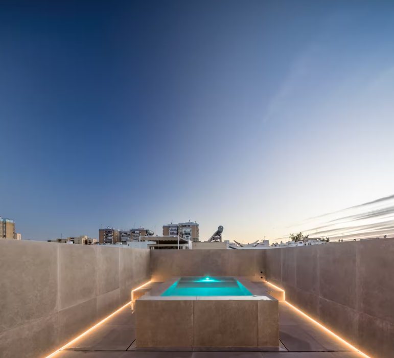 Desde esta planta se accede a la cubierta, concebida como un espacio de doble altura que culmina el proyecto con una zona de terraza, spa y piscina desbordante climatizada, apta para su uso tanto en invierno como en verano. Un auténtico oasis urbano que refuerza el carácter exclusivo y lujoso de la vivienda.